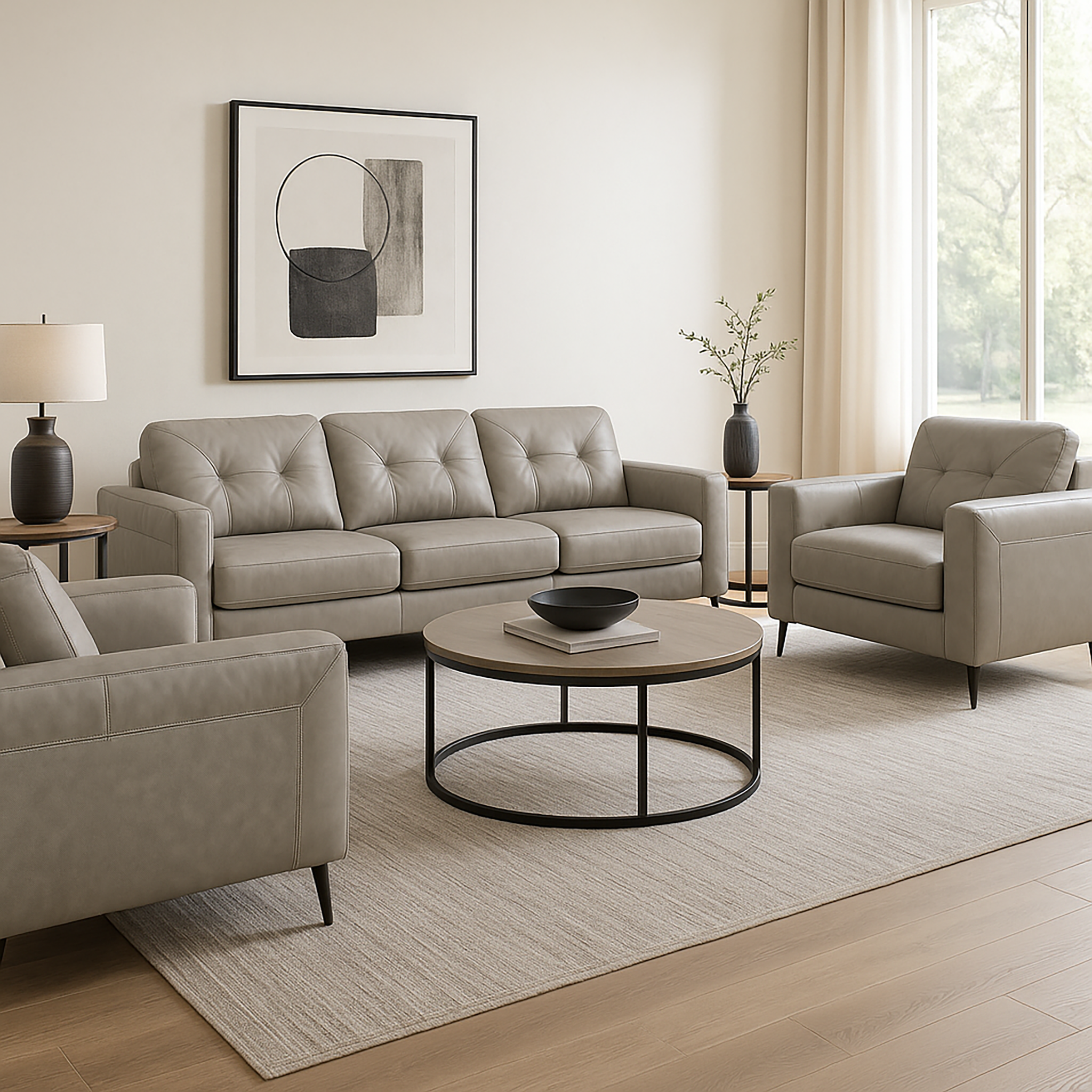 Elevate your home with the Solera Leather Sofa and Two Chairs set, a perfect balance of modern design, premium craftsmanship, and everyday comfort. Upholstered in top-grain genuine leather on all touch surfaces and reinforced with durable PU on the sides and back, this luxury leather sofa and two chairs set offers a timeless look built to last. The plush, high-resilience cushions deliver long-lasting support, while the removable seat cushions let you adjust for the ideal comfort level. Its attached back cushions maintain a sleek, tailored silhouette—keeping your space effortlessly polished. Designed with padded arms for added relaxation and a contemporary profile that complements any décor style, the Solera sofa and two chair is available in a soft ivory leather color for a warm, inviting look and refined sophistication. Whether you’re entertaining guests, enjoying movie nights, or creating a cozy reading nook, the Solera Leather Sofa and Two Chairs Set transforms your living room into a haven of style, comfort, and elegance.
